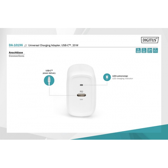 DIGITUS univerzální nabíjecí adaptér, USB-C, 20 W, bílý