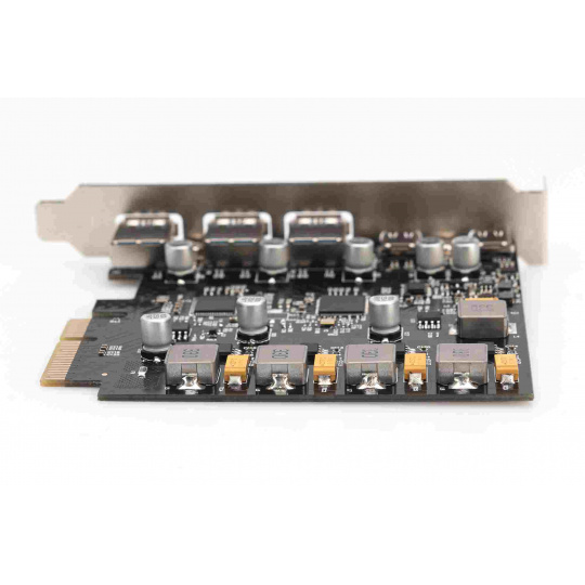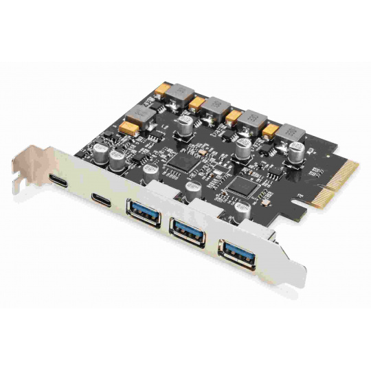 Digitus PCI Express Card rozšiřuje PC o 2x USB-C a 3x USB A port. K této kartě lze připojit různá zařízení, jako jsou pevné disky, DVD mechaniky, myš, klávesnice, čtečka karet a další.