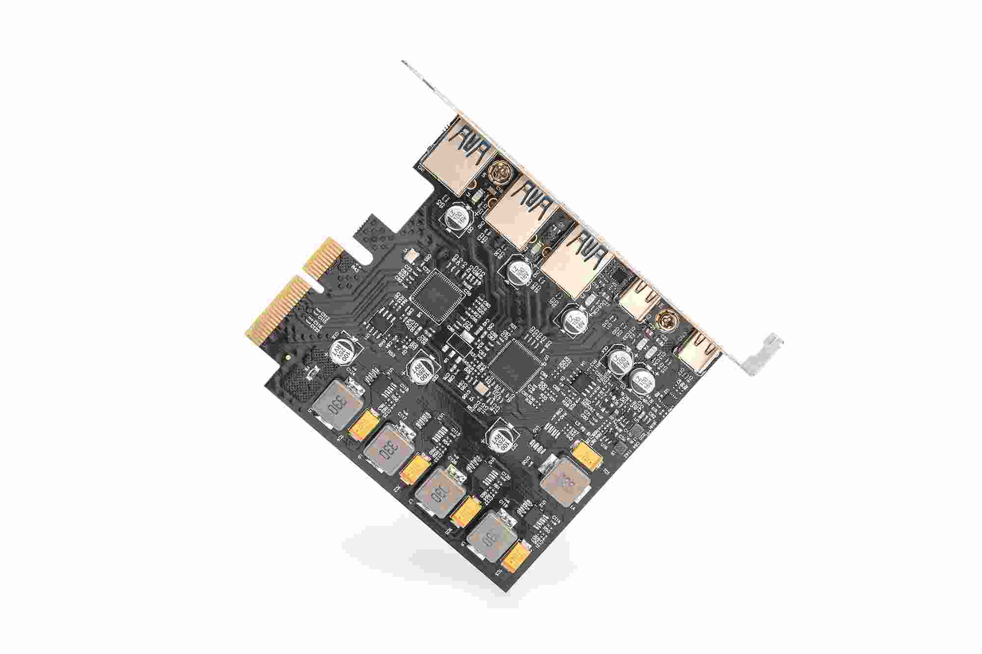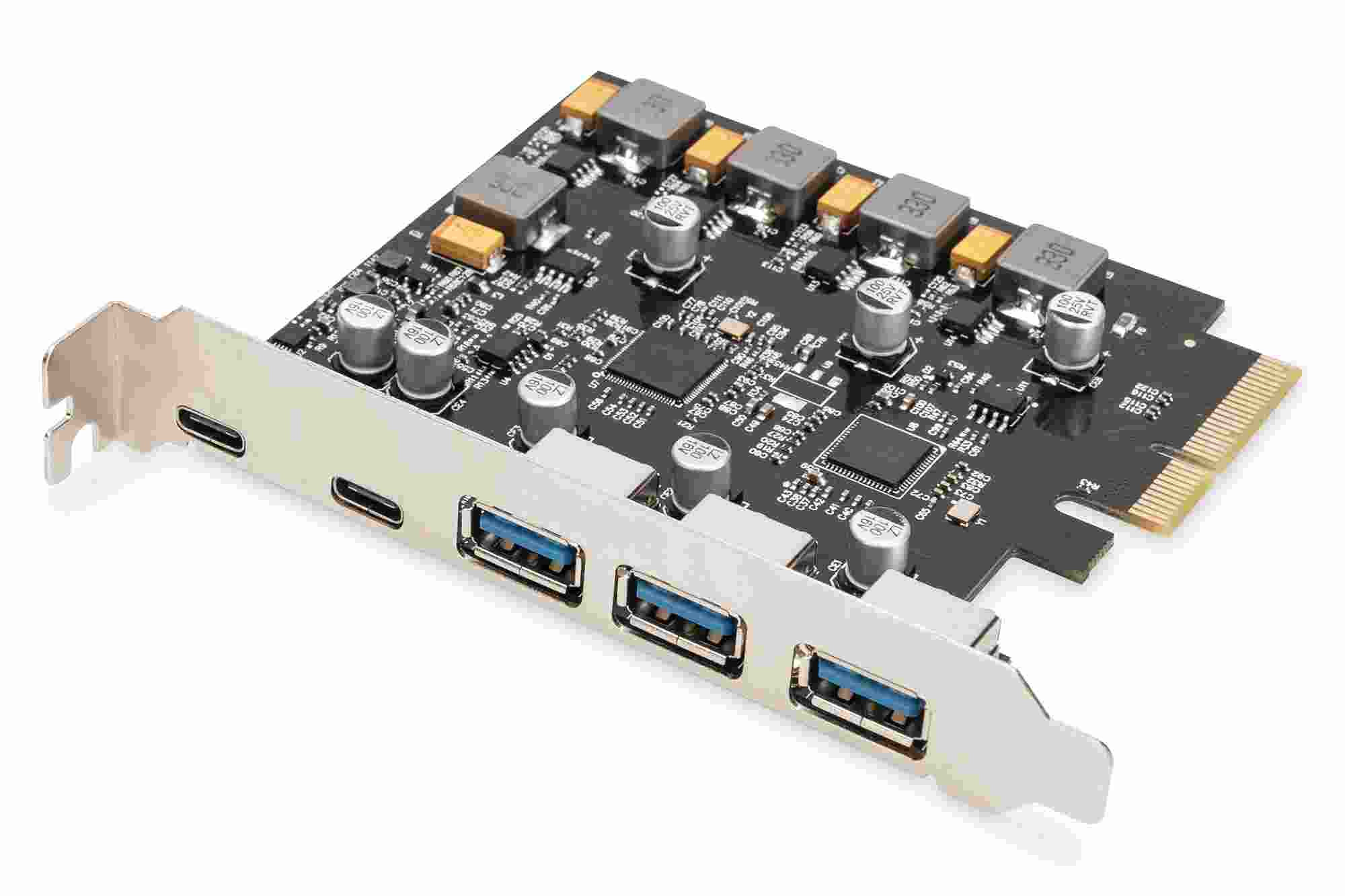 Digitus PCI Express Card rozšiřuje PC o 2x USB-C a 3x USB A port. K této kartě lze připojit různá zařízení, jako jsou pevné disky, DVD mechaniky, myš, klávesnice, čtečka karet a další.