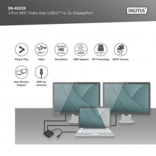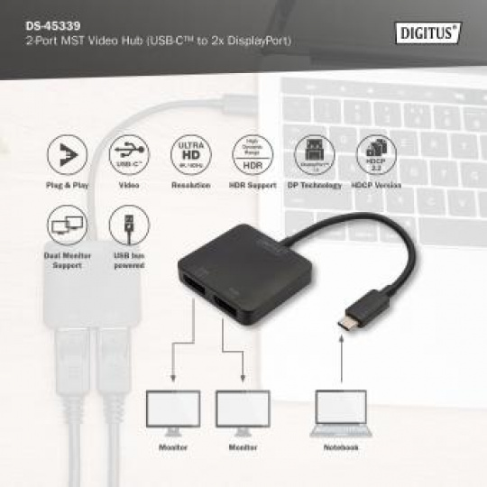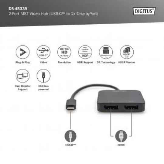 DIGITUS USB-C - 2x DP MST Video Hub DP 1.4, 4K/60Hz