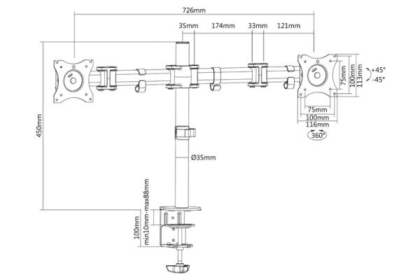 Digitus VESA dvojitý svorkový stolní stojan, 90o otočný, 30o sklopný, otočný 360o, 15"-27" TFT, 100x100, 16Kg, černý