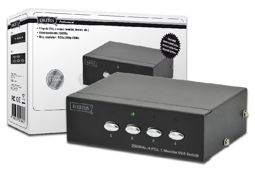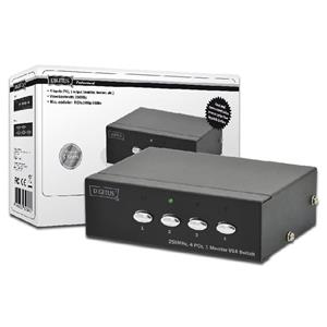 Digitus VGA přepínač, 4 vstupy, 1 výstup 250MHz, vč. napájení DC9V, 300 mA, Max. 1080p