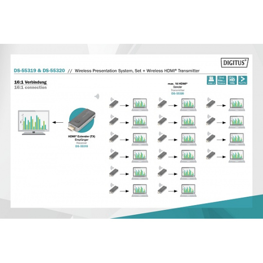 S Wireless Presentation System můžete bezdrátově přenášet HDMI video a audio signály ve Full HD na vzdálenost až 50 m s ničím nerušeným výhledem. Obsluha a instalace jsou super jednoduché. Real Plug & Play – Stačí se připojit a můžete začít. Pomocí dalších vysílačů (DS-55320) lze sadu rozšířit až na 16 vysílačových jednotek (celkem). Přepněte na požadovaný vysílač rychle a snadno stisknutím tlačítka, abyste mohli reprodukovat svůj obsah. Můžete také sdílet obsah přímo z vašeho mobilního zařízení (smartphonu/stolu) pomocí operačního systému vašeho zařízení přímo, není potřeba žádná další aplikace. Vysílač a přijímač lze napájet přes HDMI připojení vašeho zařízení (požadováno > 500 mAh). Pro bezpečný a stabilní provoz doporučujeme pro napájení TX a RX vždy používat Micro USB kabely.