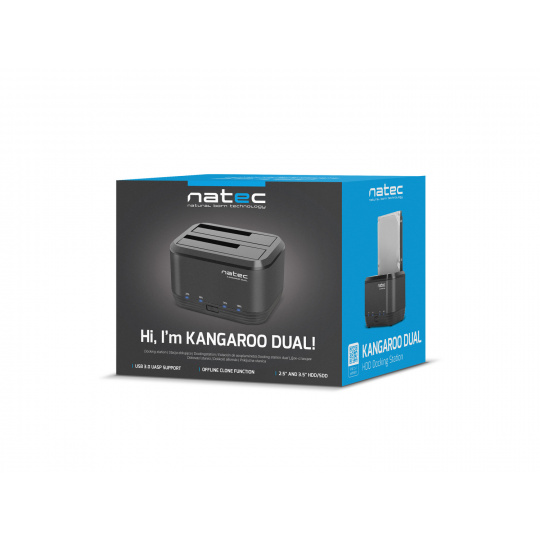 Natec Kangaroo Dual je vybavena odolným a stabilním tělem, které poskytuje vysokou bezpečnost disku nacházejícího se uvnitř a jeho optimální chlazení. Gumové nožičky ve spodní části zabraňují přesouvání dokovací stanice po stole. Disky lze vkládat a vybírat ze stanice v režimu Hot Swapp.