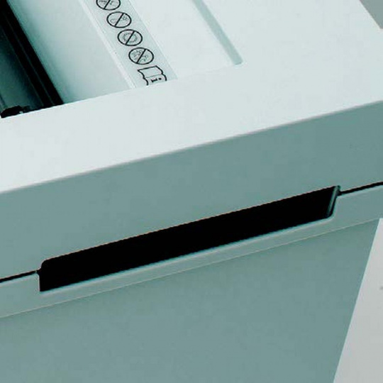 * Moderní design stroje je spojený s funkčností. Po stranách skartovací hlavy a koše jsou prolisy pro snadné uchopení skartovací hlavy a následné vyprázdnění koše.