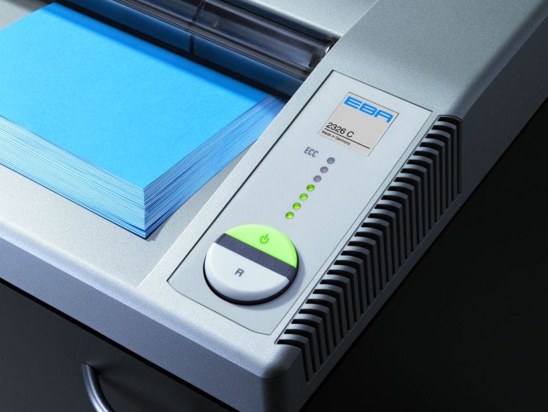 Týmový skartovač EBA 2326 je vhodný pro stálý provoz. Vstup o šíři 260 mm vám umožní skartovat až 15 listů papíru 80g v řezu 2x15 mm. Kapacita odpadního koše 100 litrů. Stroj je odolný vůči kancelářským sponkám i pro zničení CD/DVD nosičů.