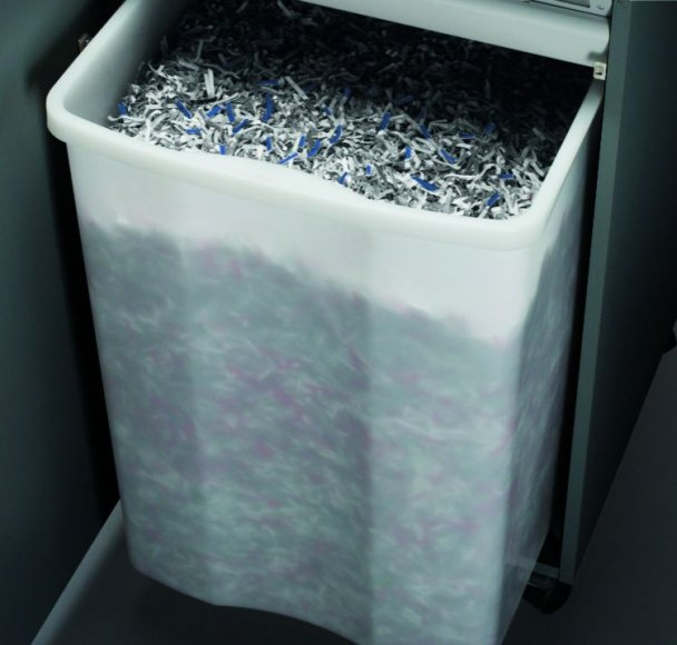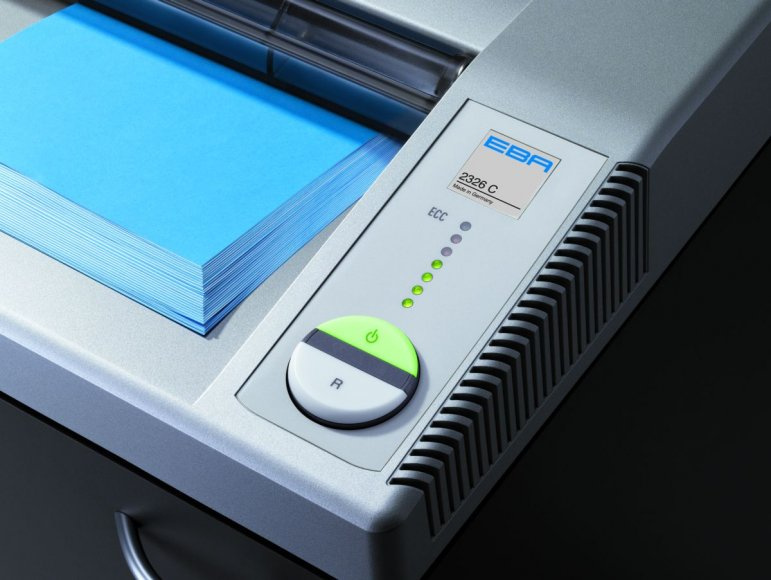 Týmový skartovač EBA 2326 je vhodný pro stálý provoz. Vstup o šíři 260 mm vám umožní skartovat až 23 listů papíru 80g v řezu 4x40 mm. Kapacita odpadního koše 100 litrů. Stroj je odolný vůči kancelářským sponkám i pro zničení CD/DVD nosičů. Pro zlepšení komfortu a bezpečnost obsluhy je skartovač vybaven patentovaným bezpečnostním a ochranným systémem (Safety Protection System), který sestává z prvků: • elektronicky řízená jistící klapka v místě vstupu • automatický zpětný chod při ucpání papírem a následné vypnutí • automatické vypnutí po naplnění odpadní nádoby • elektronická kontrola uzavření dvířek podstavy • dvoustupňové jištění motoru • úsporný režim „ZERO ENERGY“ (absolutní vypnutí odběru el. energie po 30 min ve stavu Stand-by) • ovládání pomocí vícefunkčního přepínače „EASY-SWITCH“ s přehledným menu a barevnou světelnou signalizací provozu • „ECC“ – elektronický světelný ukazatel aktuálního zatížení při skartaci • automatická start/stop funkce pomocí optického senzoru Základní technické parametry : • šířka vstupu : 260 mm • typ řezu : křížový • velikost odpadu po skartaci : 4x40 mm • stupeň utajení dle NBÚ : typ 2 – důvěrné • stupeň utajení dle DIN 66399 : P-4 • skartovací kapacita na jeden cyklus : 21-23 listů 80g papíru • objem koše : 100 l • rychlost skartace : 4,8 m / min. • skartace spon ze sešívaček : ano • skartace kancelářských spon : ano • skartace kreditních karet : ano • skartace CD : ano • příkon motoru : 640 W (umožňuje stálý provoz) • rozměry (V x Š x H): 926×495×470 mm • hmotnost : 48 kg • vysoce kvalitní dřevěná skříňka (objem 125 litrů) s odolným kováním a kolečky pro pojezd • atraktivní barevná kombinace stříbrná/antracit • vyrobeno v Německu