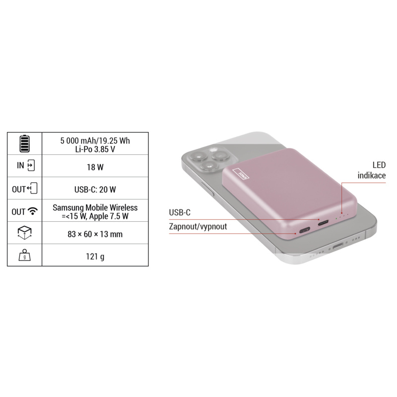 EMOS POWERBANKA WI 522, bezdrátové nabíjení 20W, 5.000mAh, LOSOSOVÁ, 1xUSB-C