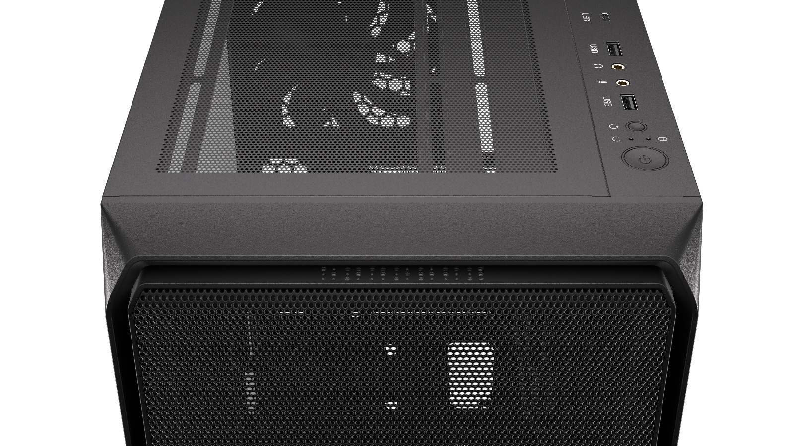 Přední I/O panel: 1× USB-C 3.2 Gen 2 (10 Gb/s), 2× USB-A 3.2 Gen 1 (5 Gb/s), 1× jack 3,5 mm (sluchátka), 1× jack 3,5 mm (mikrofon), 1× tlačítko POWER, 1× tlačítko RESET