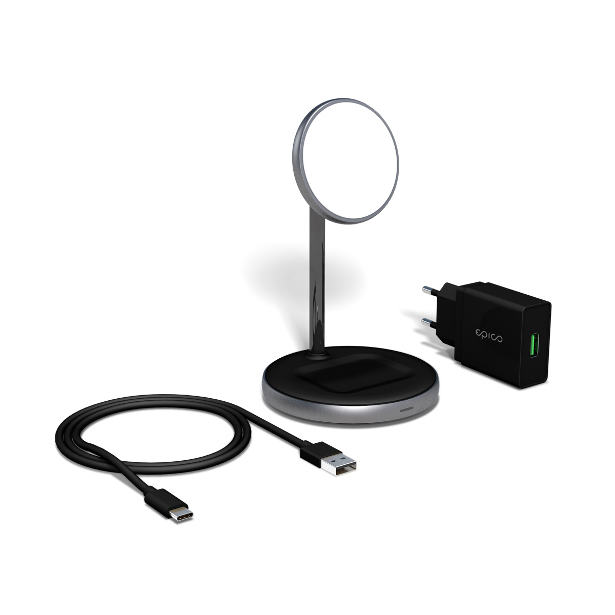 Epico 2in1 Magnetic Wireless Charger je magnetický stojan, který kombinuje funkci duálního bezdrátového nabíjení s prémiovým designem. Je kompatibilní s MagSafe a nabízí silné magnetické uchycení pro nepřerušované nabíjení. Dokáže nabíjet váš smartphone maximálním výkonem 15W (7,5W pro iPhone) a vaše AirPods výkonem až 5W. Slouží také jako praktický stojánek pro iPhone, který vám umožní sledovat videa nebo telefonovat v preferovaném úhlu. Díky LED indikátoru můžete kontrolovat stav nabíjení. Součástí balení je USB-C kabel a 18W QC síťový adaptér.
