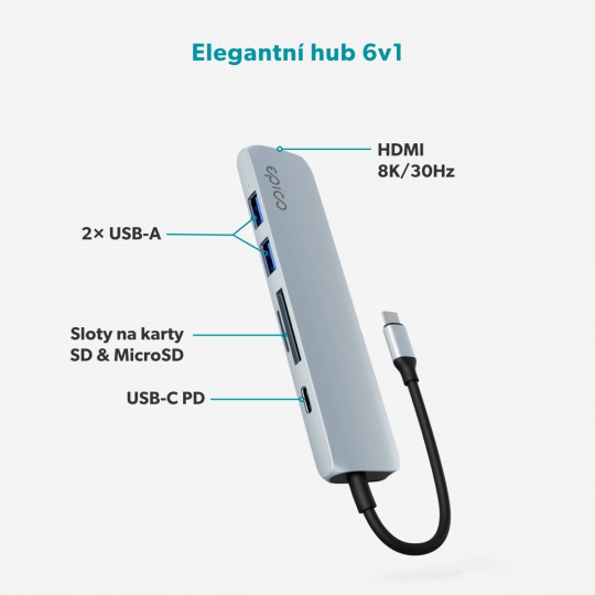 Výkonný hub s podporou až 8K Epico 6in1 Aluminium Hub přináší elegantní řešení pro každodenní práci i multimediální využití. Díky šesti základním portům – HDMI, USB-C Power Delivery, dvěma USB-A a slotům na SD i MicroSD karty – získáte spolehlivé připojení pro všechna svá zařízení. HDMI port podporuje rozlišení až 8K/30Hz nebo 4K/120Hz, takže využijete plný potenciál monitorů s vysokým rozlišením. Hub navíc prostřednictvím HDMI portu zajišťuje precizní podání dynamického obrazu a zvuku díky technologii Dynamic HDR+ s až 12bitovou barevnou hloubkou a multikanálovým zvukem, včetně Dolby Atmos a DTS:X. Rychlé přenosy a prémiový hliníkový design Průchozí nabíjení s výkonem až 100 W zaručuje, že váš notebook zůstane napájený i při maximálním zatížení. USB-A porty umožňují přenos dat rychlostí až 5 Gb/s, zatímco sloty na SD a MicroSD karty dosahují rychlosti až 104 Mb/s – ideální pro rychlé přesouvání a kopírování souborů. Hliníkové tělo zajišťuje prémiový vzhled, odolnost a efektivní odvod tepla, takže se na hub můžete spolehnout i při dlouhodobém používání.