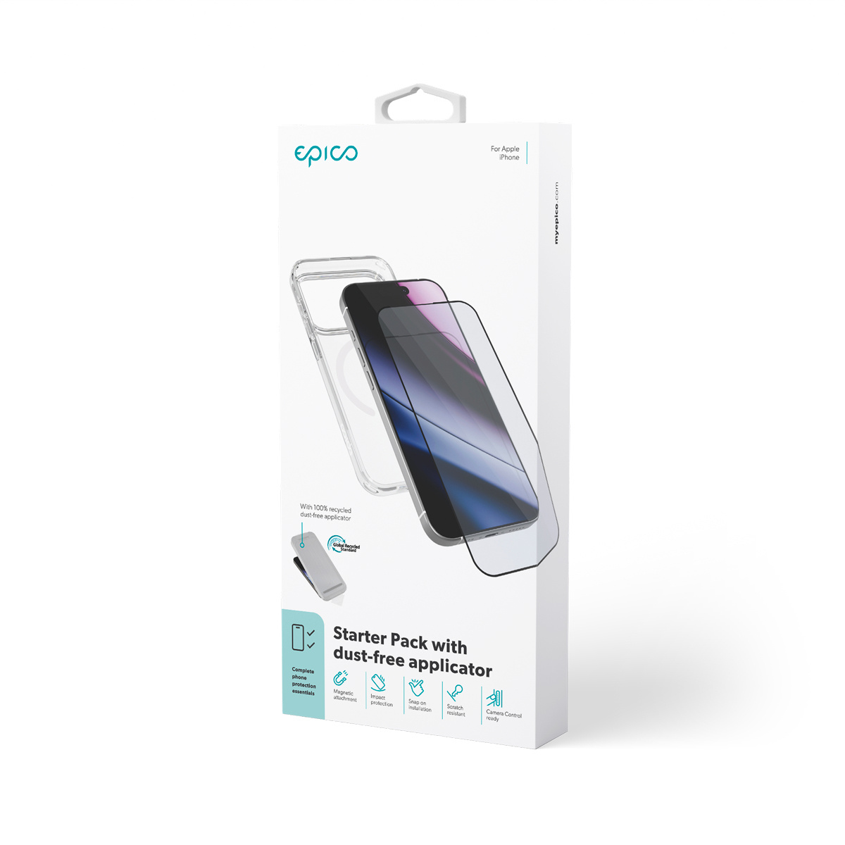 Vše pro ochranu vašeho iPhone v jednom elegantním balení Epico Starter Pack pro iPhone nabízí elegantní kombinaci krytu a ochranného skla, která spolehlivě chrání váš telefon před poškrábáním i pády. Kryt je plně kompatibilní s Qi2 i MagSafe, takže ho není nutné při bezdrátovém nabíjení ani při používání magnetického příslušenství sundávat. Vyvýšené hrany kolem displeje a čoček fotoaparátu poskytují extra bezpečí. Navíc díky integrovanému tlačítku Camera Control zůstává ovládání fotoaparátu vždy plně funkční. Transparentní design a krytí od kraje ke kraji Průhledná zadní strana krytu s UV ochranou zabraňuje zežloutnutí a zachovává původní vzhled iPhonu. Ochranné sklo kryje displej od kraje ke kraji a s tloušťkou 0,33 mm v kombinaci s tvrdostí 9H ho spolehlivě chrání, aniž by snižovalo citlivost dotyku nebo ostrost obrazu. Speciální vrstva proti otiskům prstů zároveň udržuje povrch displeje čistý a bez šmouh. Štíhlé provedení krytu a hladké 2,5D hrany skla zaručují, že váš iPhone působí elegantně a příjemně padne do ruky. Pružný rámeček krytu a jednokrokový aplikátor skla usnadňují instalaci, takže vše zvládnete rychle a snadno.