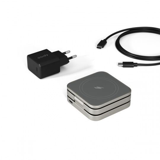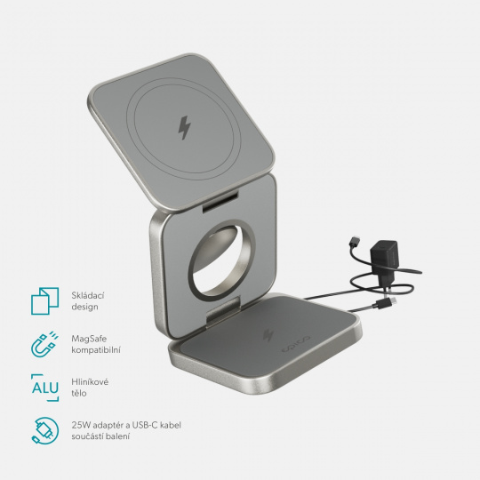 Cestovní skládací nabíječka pro všechna vaše zařízení Kompatibilita MagSafe a Qi2: Bezproblémové bezdrátové nabíjení s bezpečným magnetickým uchycením.15W bezdrátový výstup: Poskytuje až 15W bezdrátové nabíjení pro kompatibilní smartphony a 7,5W pro iPhony. 3v1 nabíjení: Umožňuje současné nabíjení smartphonu, Apple Watch (2,5W) a AirPods (5W). Hliníkové tělo: Prémiové a odolné hliníkové tělo zabraňuje přehřívání. Kompaktní design: Po složení zabere minimum místa, takže ji snadno vezmete kamkoli s sebou. Stabilní silikonová základna s protiskluzovou silikonovou základnou. Flexibilní umístění: Podporuje umístění smartphonu na výšku i na šířku.
