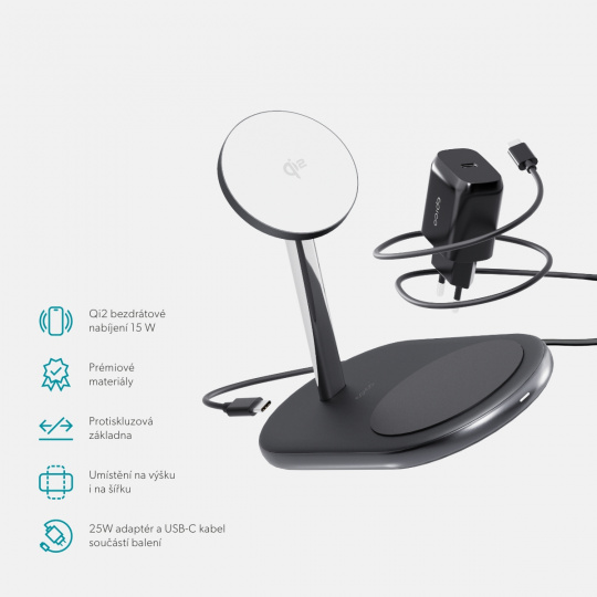 Qi2 bezdrátová nabíječka 2v1, 15 W bezdrátový výstup pro iPhone i Android, nabíjecí základna 5 W, 25W adaptér a USB-C kabel v balení, barva černá. Bezproblémové nabíjení s propracovaným designem Elegantní design: Vyrobeno z prémiových materiálů, které z této nabíječky dělají krásný doplněk na váš stůl. Certifikace Qi2 & kompatibilita s MagSafe. Užijte si až 2x rychlejší bezdrátové Qi2 nabíjení pro iPhone (15W) s magnetickým uchycením. 2v1 nabíjení: Umožňuje současné nabíjení smartphonu a AirPods (5W). Stabilní gumová základna: Vybavena protiskluzovou gumovou základnou pro lepší stabilitu. Flexibilní umístění: Podporuje umístění smartphonu na výšku i na šířku. Kompletní balení: Součástí je 25W síťová nabíječka a USB-C na USB-C kabel.