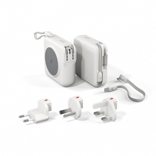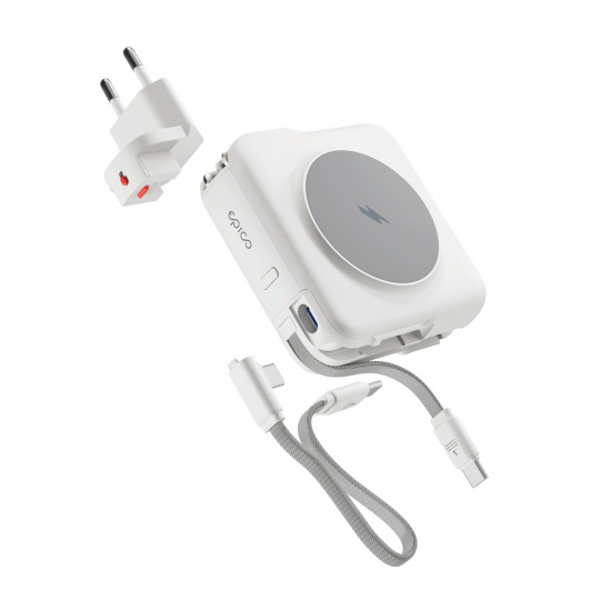 Powerbanka, nabíječka a adaptér v jednom Epico UltraPack 3in1 ET50 představuje praktické řešení pro každodenní nabíjení i cestování. Spojuje powerbanku, bezdrátovou nabíječku a síťový adaptér do jediného kompaktního zařízení. S kapacitou 10 000 mAh zajistí dostatek energie na celý den, ať už jste kdekoliv. Díky podpoře Qi2 a MagSafe můžete snadno nabíjet pomocí magnetického bezdrátového nabíjení – až 15 W pro kompatibilní zařízení a 7,5 W pro iPhone. Univerzální řešení na cesty Vestavěná US zástrčka spolu s přiloženými adaptéry pro EU, UK a AU zajistí kompatibilitu prakticky kdekoliv na světě bez nutnosti přenášet více různých nabíječek. Při zapojení do sítě poskytuje výkon až 30 W přes USB-C a v režimu powerbanky umožňuje kabelové nabíjení výkonem až 20 W. Součástí balení jsou dva opletené USB-C kabely – vestavěný a odnímatelný oba podporující rychlé nabíjení až 60 W. Přehledný LED indikátor navíc zobrazuje aktuální kapacitu baterie.