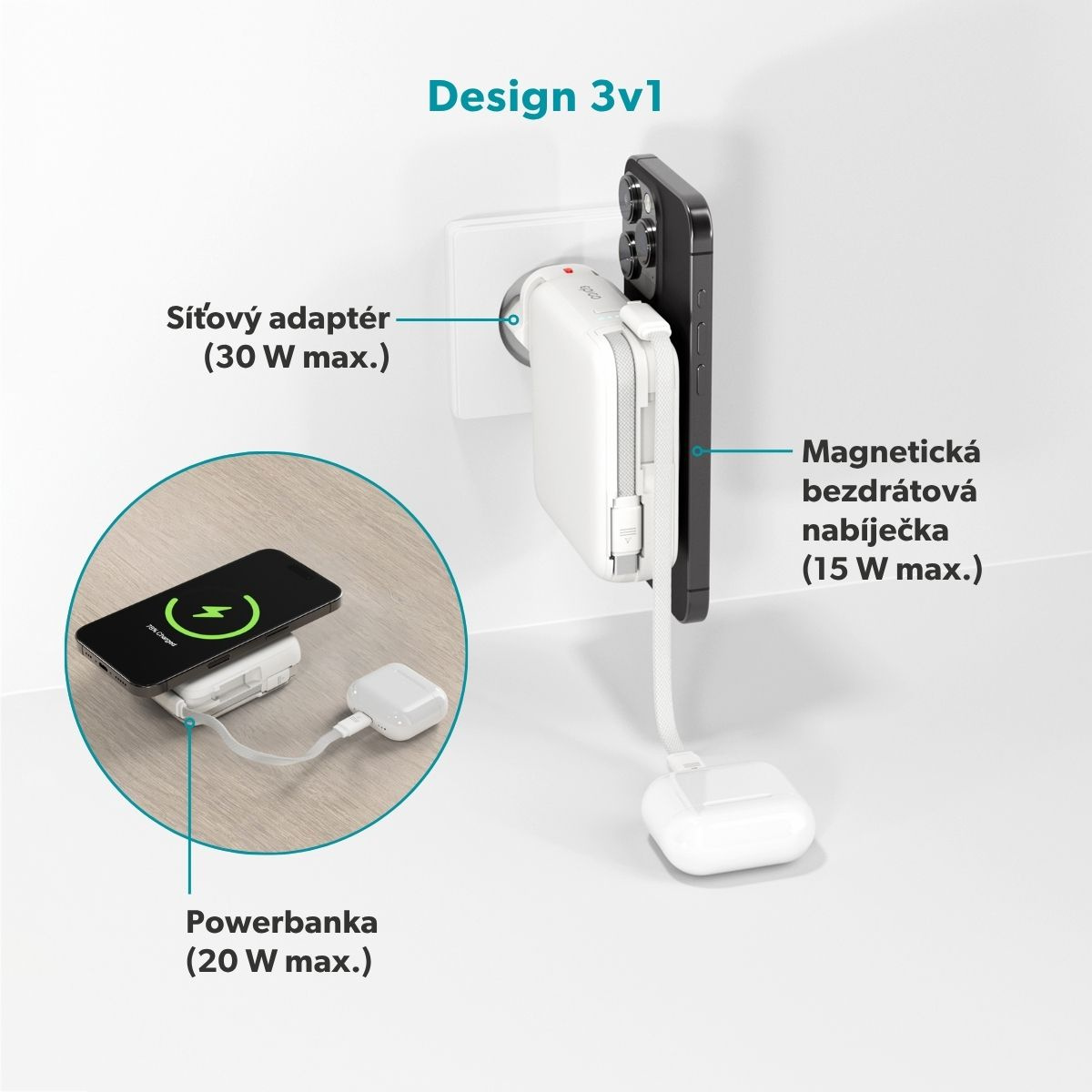 Powerbanka, nabíječka a adaptér v jednom Epico UltraPack 3in1 ET50 představuje praktické řešení pro každodenní nabíjení i cestování. Spojuje powerbanku, bezdrátovou nabíječku a síťový adaptér do jediného kompaktního zařízení. S kapacitou 10 000 mAh zajistí dostatek energie na celý den, ať už jste kdekoliv. Díky podpoře Qi2 a MagSafe můžete snadno nabíjet pomocí magnetického bezdrátového nabíjení – až 15 W pro kompatibilní zařízení a 7,5 W pro iPhone. Univerzální řešení na cesty Vestavěná US zástrčka spolu s přiloženými adaptéry pro EU, UK a AU zajistí kompatibilitu prakticky kdekoliv na světě bez nutnosti přenášet více různých nabíječek. Při zapojení do sítě poskytuje výkon až 30 W přes USB-C a v režimu powerbanky umožňuje kabelové nabíjení výkonem až 20 W. Součástí balení jsou dva opletené USB-C kabely – vestavěný a odnímatelný oba podporující rychlé nabíjení až 60 W. Přehledný LED indikátor navíc zobrazuje aktuální kapacitu baterie.