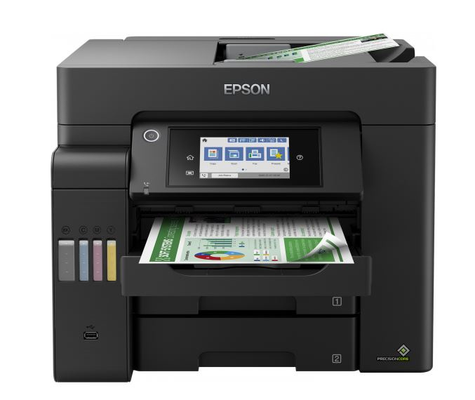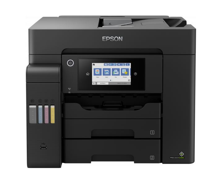 S touto snadno použitelnou tiskárnou EcoTank můžete tisknout, skenovat, kopírovat a faxovat dokumenty při opravdu výjimečně nízkých nákladech na jednu stránku. Veškeré úlohy lze zvládat rychle díky vysoké rychlosti tisku a skenování, dvěma předním zásobníkům na 250 listů, zadnímu podavači na 50 listů a automatickému podavači dokumentů o kapacitě 50 listů. Díky funkcím mobilního tisku, Ethernet připojení a dotykovému LCD displeji s úhlopříčkou 10,9 cm můžete tisknout tak, jak právě potřebujete.