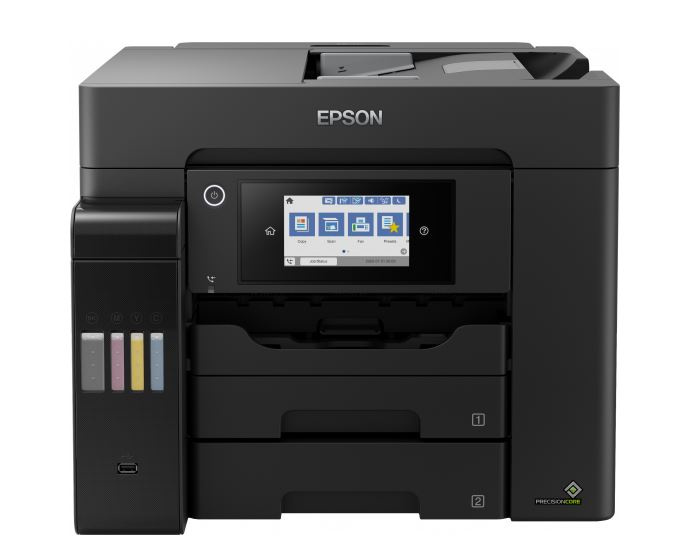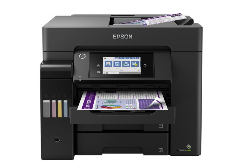 S touto snadno použitelnou tiskárnou EcoTank můžete tisknout, skenovat, kopírovat a faxovat dokumenty při opravdu výjimečně nízkých nákladech na jednu stránku. Veškeré úlohy lze zvládat rychle díky vysoké rychlosti tisku a skenování, dvěma předním zásobníkům na 250 listů, zadnímu podavači na 50 listů a automatickému podavači dokumentů o kapacitě 50 listů. Díky funkcím mobilního tisku, Ethernet připojení a dotykovému LCD displeji s úhlopříčkou 10,9 cm můžete tisknout tak, jak právě potřebujete.