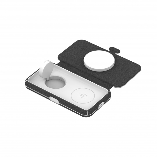 Skládací nabíječka s nabíjecí plochou pro smartphone, MFW rychlo-nabíjecím modulem pro Apple Watch a bezdrátovou nabíjecí plochou pro kompatibilní sluchátka. Součástí balení je USB-C/USB-C kabel v délce 2 metry. Kompatibilní s MagSafe a Qi, rychlo-nabíjecí MFW certifikovaný modul pro Apple Watch a bezdrátovou nabíjecí plochu pro kompatibilní sluchátka. Díky tomu můžete pohodlně dobíjet tři zařízení současně. Barva: černá