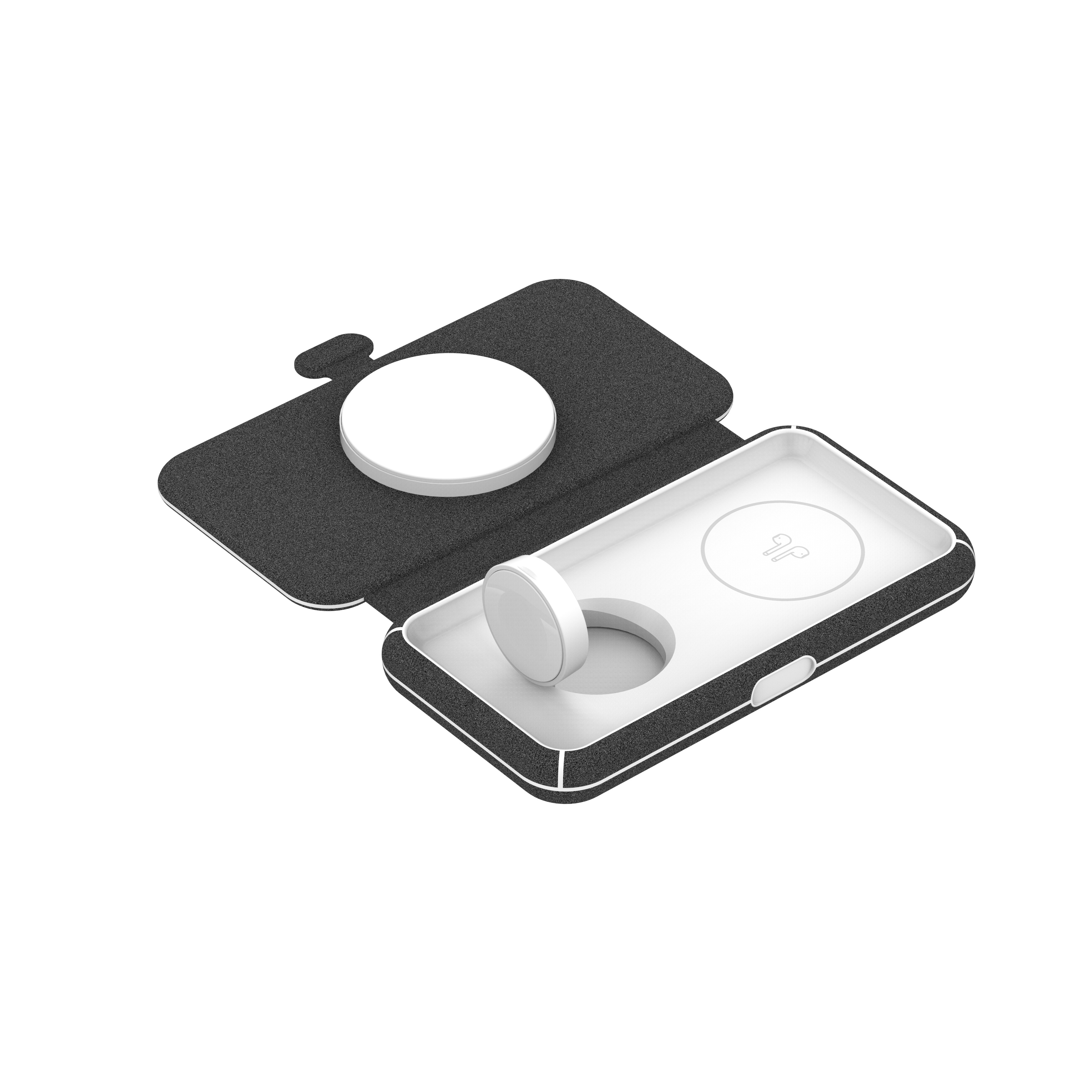 Skládací nabíječka s nabíjecí plochou pro smartphone, MFW rychlo-nabíjecím modulem pro Apple Watch a bezdrátovou nabíjecí plochou pro kompatibilní sluchátka. Součástí balení je USB-C/USB-C kabel v délce 2 metry. Kompatibilní s MagSafe a Qi, rychlo-nabíjecí MFW certifikovaný modul pro Apple Watch a bezdrátovou nabíjecí plochu pro kompatibilní sluchátka. Díky tomu můžete pohodlně dobíjet tři zařízení současně. Barva: černá