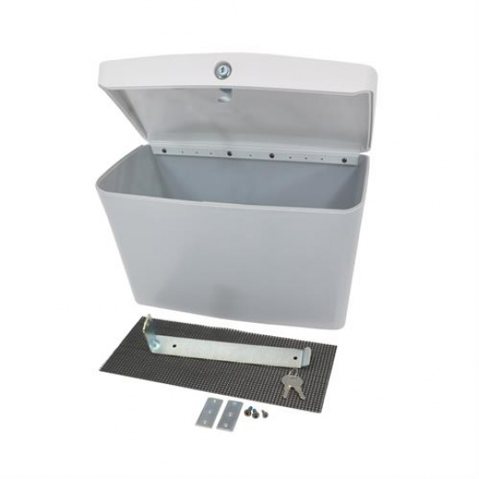 Includes bin with locking lid, keys, liner mat, mounting hardware