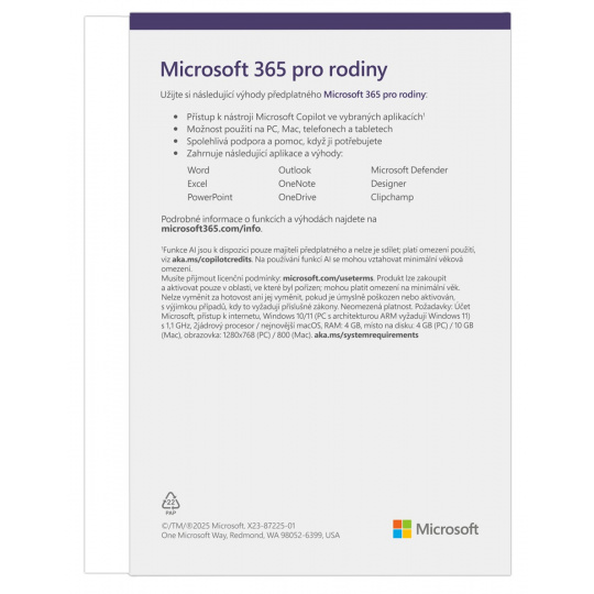 Microsoft 365 pro rodiny je předplatné až pro 1–6 osob, jehož součástí je pokročilé zabezpečení, cloudové úložiště a inovativní aplikace využívající AI.