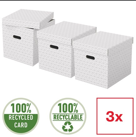 Sada 3 velkých dekorativních lepenkových úložných krychlí Esselte Home na dokumenty a větší věci v domácnosti. Rychlé a snadné sestavení.