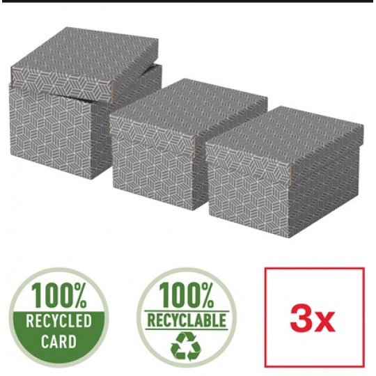 Set 3 krabic, sundavací víko, vyrobeno z odolné 100% recyklované lepenky, 100% recyklovatelné, certifikát FSC, otíratelný povrch, dodáváno v nesloženém stavu, barva: šedá/bílá, rozměry: 200x150x255 mm (ŠxVxH)