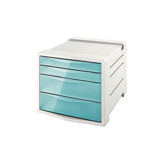 Atraktivní zásuvkový box s barevně průhlednými zásuvkami a se světle šedým tělem. Dvě malé a dvě velké zásuvky se snadným vysouváním pro snadnou organizaci předmětů. Perfektně doplňuje ostatní výrobky z řady Colour'Ice.