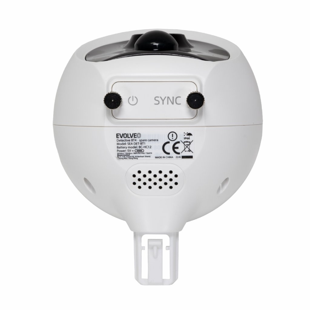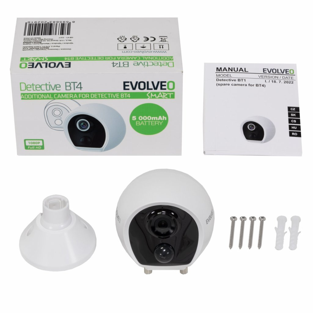 Náhradní kamera určená pro rozšíření instalace EVOLVEO Detective BT4. Kamera je vybavená akumulátorem s 5000mAh kapacitou. Pod krytkou se nachází USB-C konektor pro nabíjení a tlačítko pro zapnutí/vypnutí a párovací režim. Kamera je vybavená nočním IR přísvitem a PIR čidlem pro rozeznání pohybu. Součástí kamery je i mikrofon a reproduktor pro obousměrnou hlasovou komunikaci. Kamera se do svého držáku pouze jednoduše nasune, což usnadňuje její montáž. V případě potřeby nabití akumulátoru, lze kameru jednoduše z držáku sejmout zatlačením na jeho západku. Kamera je vyrobena ve shodě se standardem IP66, lze ji umístit i ve venkovních prostorách, je ale nutné se vždy ubezpečit, že je řádně zavřená spodní krytka.Kamera je samostatně nefunkční, je nutné ji použít spolu s kamerovým systémem EVOLVEO Detective BT4 SMART !