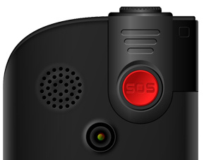 Na zadní straně telefonu se nachází SOS tlačítko, po jehož stisknutí telefon začne automaticky vytáčet předvolená čísla a odešle na ně nouzovou zprávu. Je možno zvolit až pět telefonních čísel, na které bude voláno a zaslána SMS.