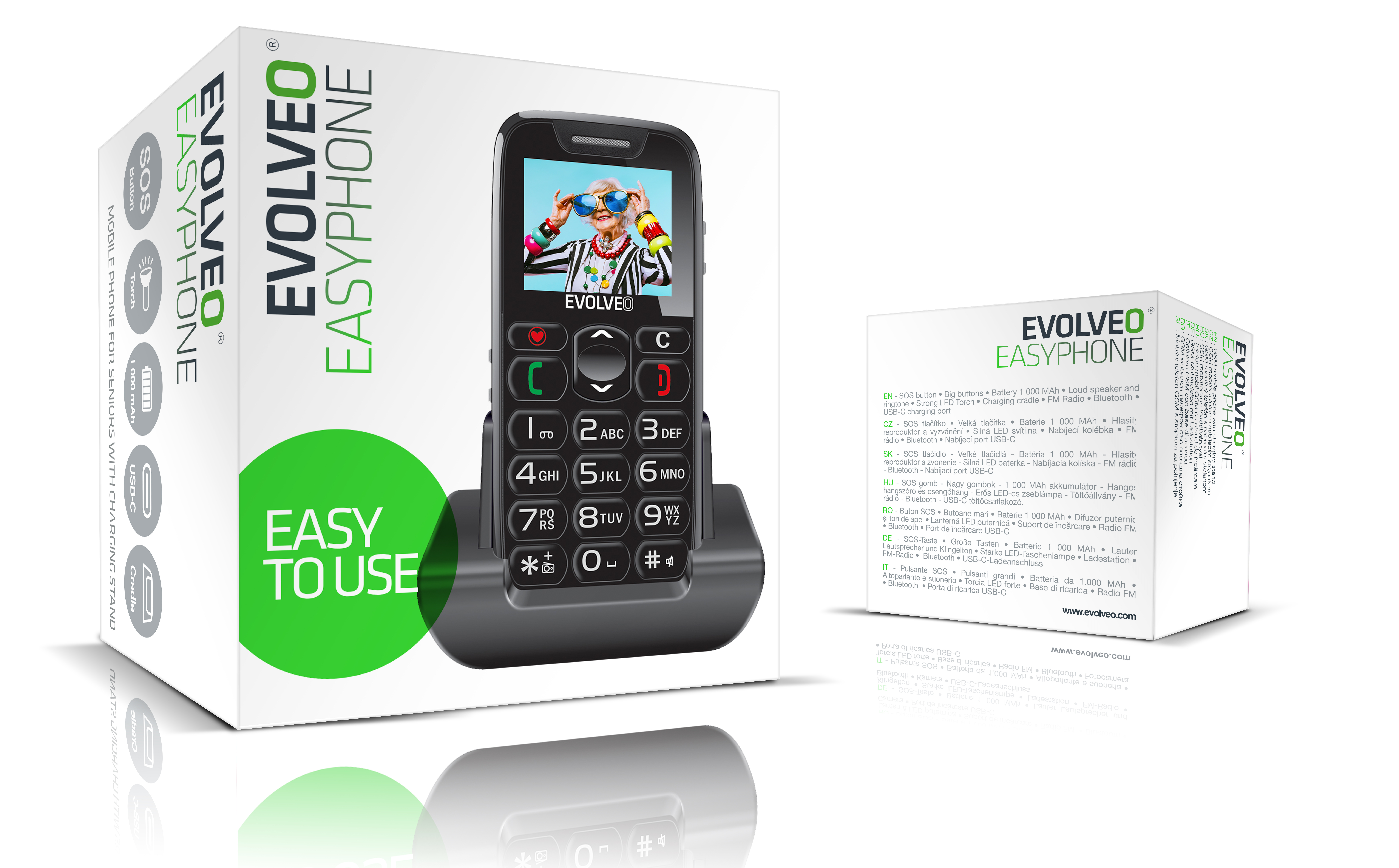EVOLVEO EasyPhone, mobilní telefon pro seniory s nabíjecím stojánkem, černá
