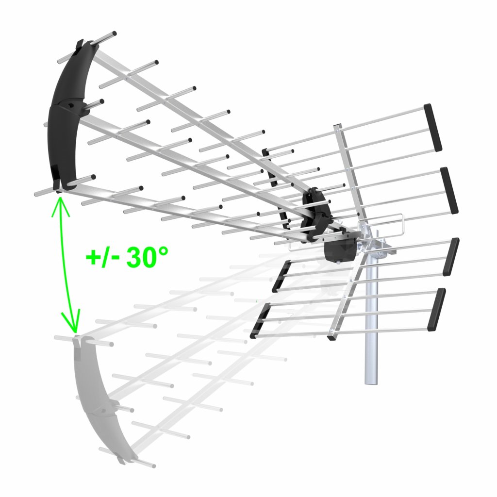 Venkovní, pasivní anténa pro příjem DVB-T/T2 signálu. Možnost vertikálního nastavení +/- 30° zvyšuje její zisk ve srovnání s anténami, které tuto nastavitelnost nemají.