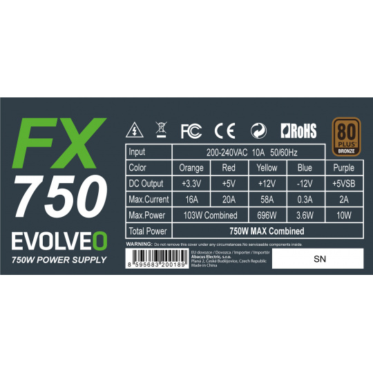 EVOLVEO FX 750, zdroj 750W ATX, 14cm, tichý, 80+, Bronze, záruka 3 roky