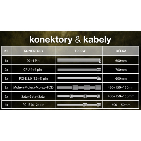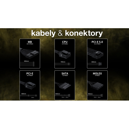 Zdroj EVOLVEO G1000 je ideální volba pro herní počítač, který má osazenou grafickou kartu s rozhraním PCIe 5.0. Vyjímá se především účinností s certifikací 80 PLUS GOLD zaručující účinnost až 90%. Zdroj je plně modulární, z toho důvodu je možné připojit jen nejnutnější kabely. Součástí je i tichý 140mm ventilátor. Vzhledem k velkému výkonu nemá tento zdroj semi-pasivní chlazení. Ventilátor zdroje je v stále v provozu a jeho otáčky jsou regulovány v závislosti na potřebě chlazení