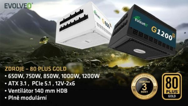 EVOLVEO G650 zdroj 650W, 80+ GOLD, ATX 3.1, PCIe 5.1, aPFC, 140mm ventilátor, modulární, záruka 3 roky, černý