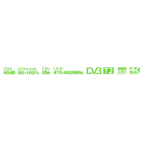 Vestavěný zesilovač s externím napájením a parametry předurčují anténu pro použití v oblastech se slabým TV signálem. Produkt je vybavený LTE filtrem, který odfiltruje signál mobilních operátorů a příjem TV signálu je tak zcela bez komplikací. Anténa zvládá příjem v širokém spektru 470-700MHz a umožní tak příjem všech TV kanálů. Účinnost přeměny TV signálu na elektrický signál je 90-100% v závislosti na frekvenci signálu. Anténa je připravena na příjem TV ve vysokém rozlišení obrazu 4K/UHD. Speciální aerodynamický tvar antény má lepší prevenci proti sněhu, čí proudění větru než antény klasických tvarů.