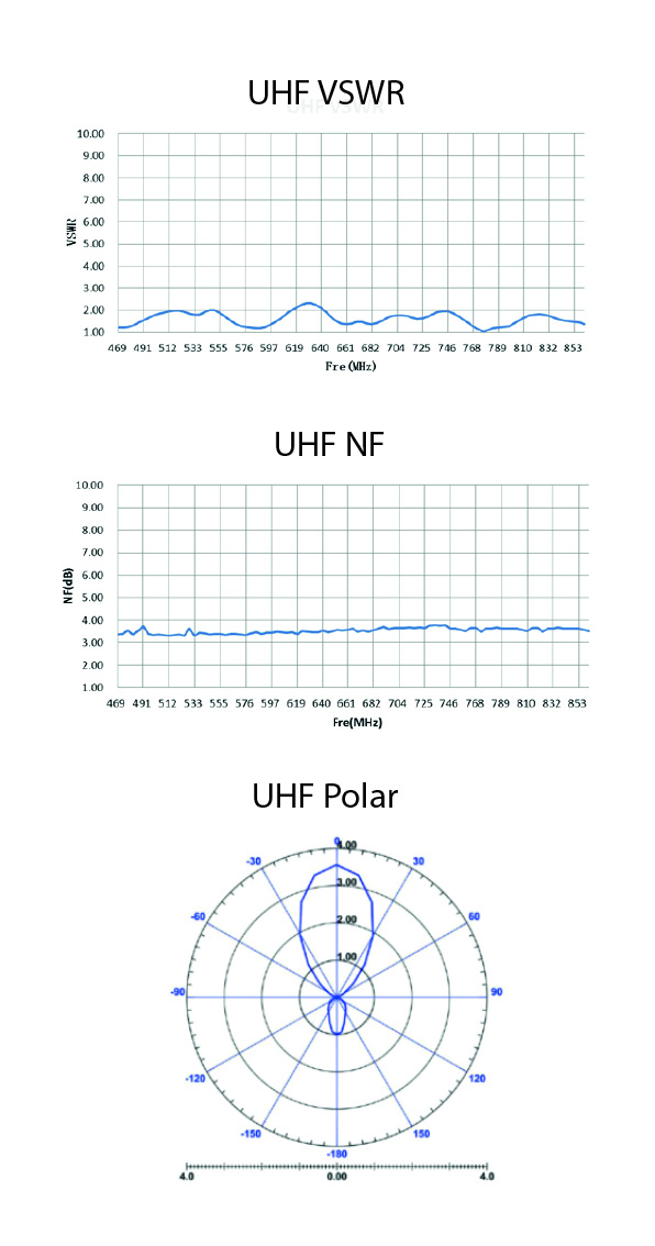 UHF VSWR (Voltage Standing Wave Ratio) graf vyjadřuje účinnost antény pro pásmu UHF. Koeficientem VSWR rovný 1 znamená přeměnu všech elektromagnetických vln na elektrický signál. Graf VSWR pro anténu HDO dosahuje velice vyrovnané účinnosti a prakticky pro žádné frekvenční pásmo nevykazuje nižší účinnost než 90%, tedy hodnota grafu VSWR není až na výjimky vyšší než 2.
