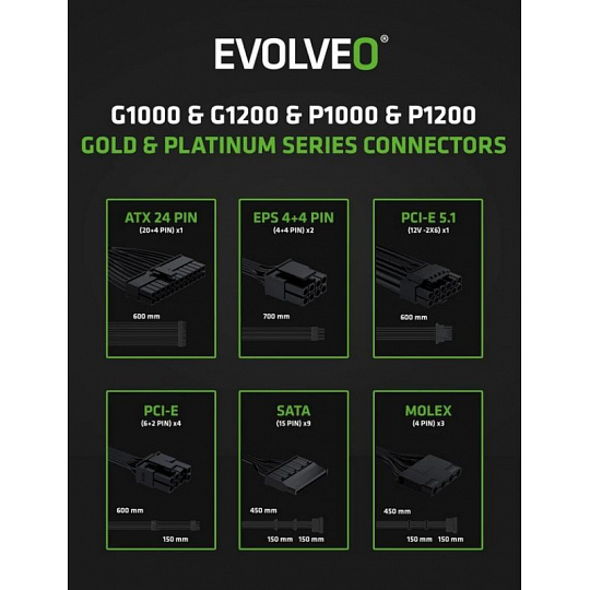 Zapomeňte na zamotané kabely, které brání proudění vzduchu a ještě vaší počítačové skříni kazí styl. Zdroj EVOLVEO P1000-BK je plně modulární, takže k němu připojíte jen ty kabely, které opravdu potřebujete. Součástí balení jsou všechny důležité šňůry – jeden kabel ATX 24 PIN, dva EPS 4+4 PIN, dva PCI-E 6+2 PIN, jeden PCI-E 5.1 12V-2×6, tři SATA a jeden MOLEX. Díky tomu máte místo na vše od CPU a GPU přes disky až po vymazlené LED pásky či jiné extra prvky.