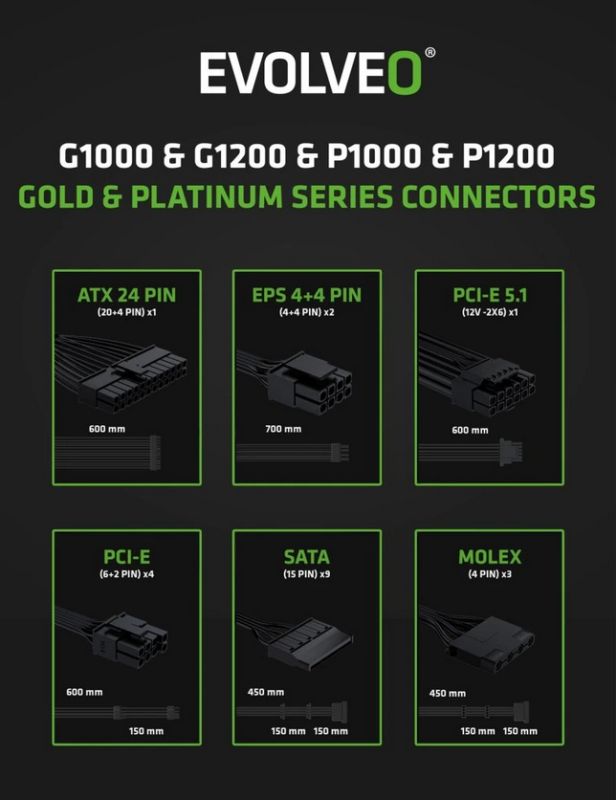 Zapomeňte na zamotané kabely, které brání proudění vzduchu a ještě vaší počítačové skříni kazí styl. Zdroj EVOLVEO P1000-BK je plně modulární, takže k němu připojíte jen ty kabely, které opravdu potřebujete. Součástí balení jsou všechny důležité šňůry – jeden kabel ATX 24 PIN, dva EPS 4+4 PIN, dva PCI-E 6+2 PIN, jeden PCI-E 5.1 12V-2×6, tři SATA a jeden MOLEX. Díky tomu máte místo na vše od CPU a GPU přes disky až po vymazlené LED pásky či jiné extra prvky.