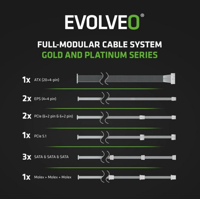 Zapomeňte na zamotané kabely, které brání proudění vzduchu a ještě vaší počítačové skříni kazí styl. Zdroj EVOLVEO P1200-BK je plně modulární, takže k němu připojíte jen ty kabely, které opravdu potřebujete. Součástí balení jsou všechny důležité šňůry – jeden kabel ATX 24 PIN, dva EPS 4+4 PIN, dva PCI-E 6+2 PIN, jeden PCI-E 5.1 12V-2×6, tři SATA a jeden MOLEX. Díky tomu máte místo na vše od CPU a GPU přes disky až po vymazlené LED pásky či jiné extra prvky.