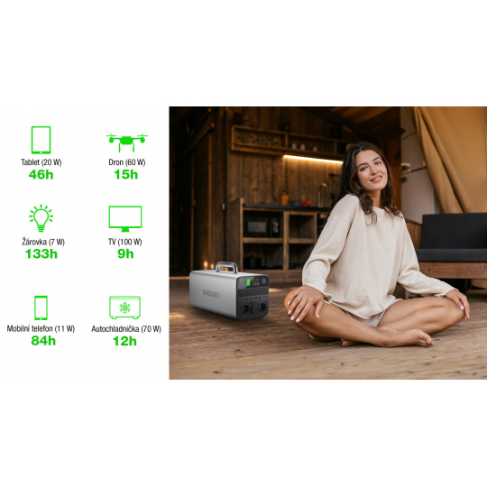 • Výdrž napájení spotřebiče: tablet (20 W) – 46 h, dron (60 W) – 15 h, mobilní telefon (11 W) – 84 h, žárovka (7 W) – 133 h, TV (100 W) – 9 h, autochladnička (70 W) - 12 h