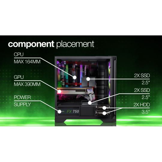 Vnitřní prostor této herní počítačové skříně je navržen tak velkoryse, že může být základem i pro ty nejambicióznější počítačové sestavy. Chladič procesoru může měřit až 164 mm na výšku. Grafická karta se sem vejde v délce až 390 mm. A pro ukládání dat je k dispozici místo pro 2 klasické pevné disky (3,5") a 3 moderní rychlá SSD úložiště (2,5"). Každá hardwarová součástka je zkrátka v této digitální pevnosti vítaným hostem a dostane se jí péče jako na císařském dvoře. Roli přitom nehraje ani její urozený původ – do skříně se dají vložit základní desky Intel i AMD, přičemž jsou podporovány formáty ATX, eATX (Extended ATX), mATX (Micro ATX) i mITX (mini ITX).