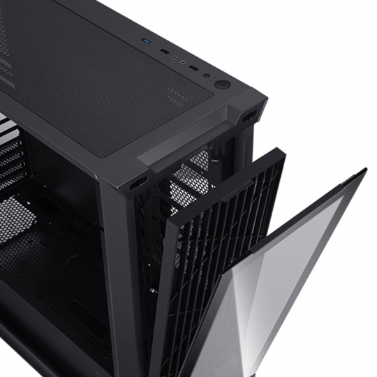 Hned na první pohled vás tato PC skříň zaujme stylovým průhledným provedením. Čelní panel i bočnice jsou vyrobeny z temperovaného skla, takže při pohledu na počítač můžete obdivovat světelnou show RGB ventilátorů nebo se na vlastní oči přesvědčit, že hardware šlape jak švýcarské hodinky. Použité bezpečnostní sklo o síle 4 mm má navíc i další výhodu – kdyby nedejbože došlo k nehodě, nezasype vás ostrými střepy, ale rozpadne se na neškodné drobné kousky.