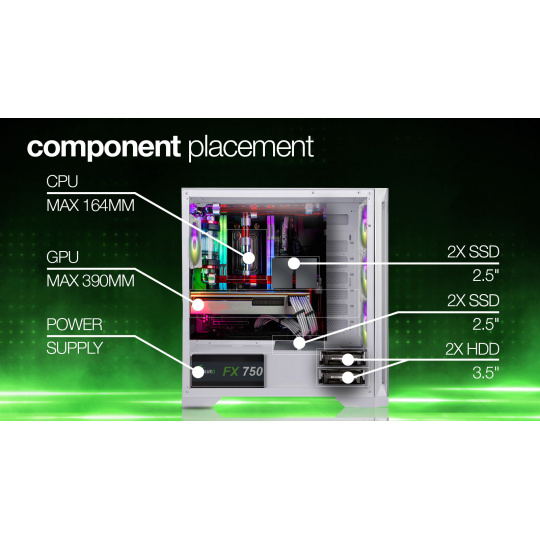 Vnitřní prostor této herní počítačové skříně je navržen tak velkoryse, že může být základem i pro ty nejambicióznější počítačové sestavy. Chladič procesoru může měřit až 164 mm na výšku. Grafická karta se sem vejde v délce až 390 mm. A pro ukládání dat je k dispozici místo pro 2 klasické pevné disky (3,5") a 3 moderní rychlá SSD úložiště (2,5"). Každá hardwarová součástka je zkrátka v této digitální pevnosti vítaným hostem a dostane se jí péče jako na císařském dvoře. Roli přitom nehraje ani její urozený původ – do skříně se dají vložit základní desky Intel i AMD, přičemž jsou podporovány formáty ATX, eATX (Extended ATX), mATX (Micro ATX) i mITX (mini ITX).