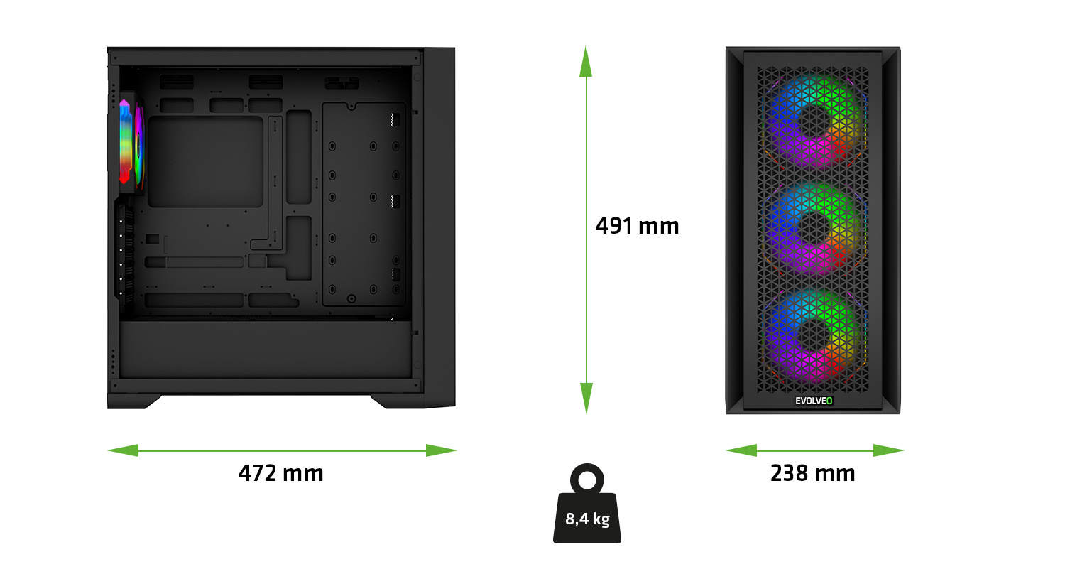 V počítačové skříni EVOLVEO Rhino-BK-4 je dostatek místa na všechno, co má nadupaná herní mašina mít. Vejde se sem až 415mm grafická karta, chladič procesoru o výšce až 180 mm i všechny potřebné disky – ve skříni jsou 4 pozice pro 3,5" HDD a 5 slotů pro 2,5" SSD. Nic vám tak nebrání sestavit si počítač, jehož hardware hraje první ligu.