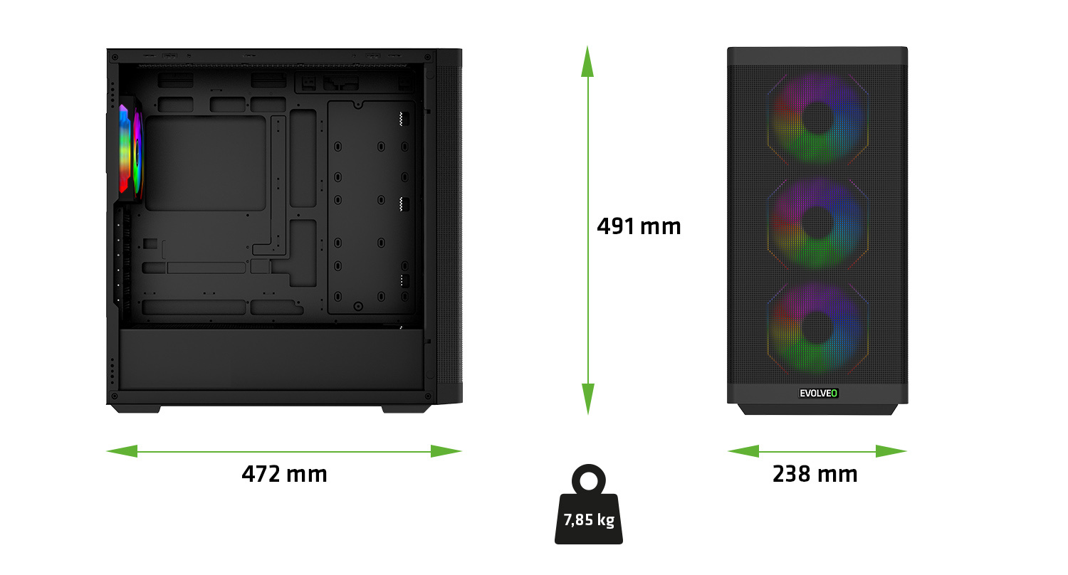 V počítačové skříni EVOLVEO Scorpio-BK-4 je dostatek místa na všechno, co má nadupaná herní mašina mít. Vejde se sem až 415mm grafická karta, chladič procesoru o výšce až 180 mm i všechny potřebné disky – ve skříni jsou 4 pozice pro 3,5" HDD a 5 slotů pro 2,5" SSD. Nic vám tak nebrání sestavit si počítač, jehož hardware hraje první ligu.