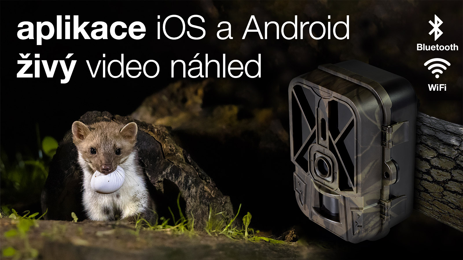 Fotopast je vybavená bezdrátovými technologiemi Bluetooth a WiFi, díky ním připojíte fotopast na přímo ke svému chytrému telefonu, ať už se systémem Google Android nebo Apple iOS. Díky aplikaci a funkci Liveview - živý náhled můžete již nastavenou a připravenou kameru nasměrovat přesně na vámi zvolené místo. Kameru tedy nemusíte při každé kontrole sundávat z prvotního umístění. Stačí být od ní ve vzdálenosti do 20m, což Vám umožňuje se k ní pomocí aplikace připojit a následně si prohlédnout nebo stáhnout pořízené snímky, zkontrolovat stav baterie, či změnit nastavení.