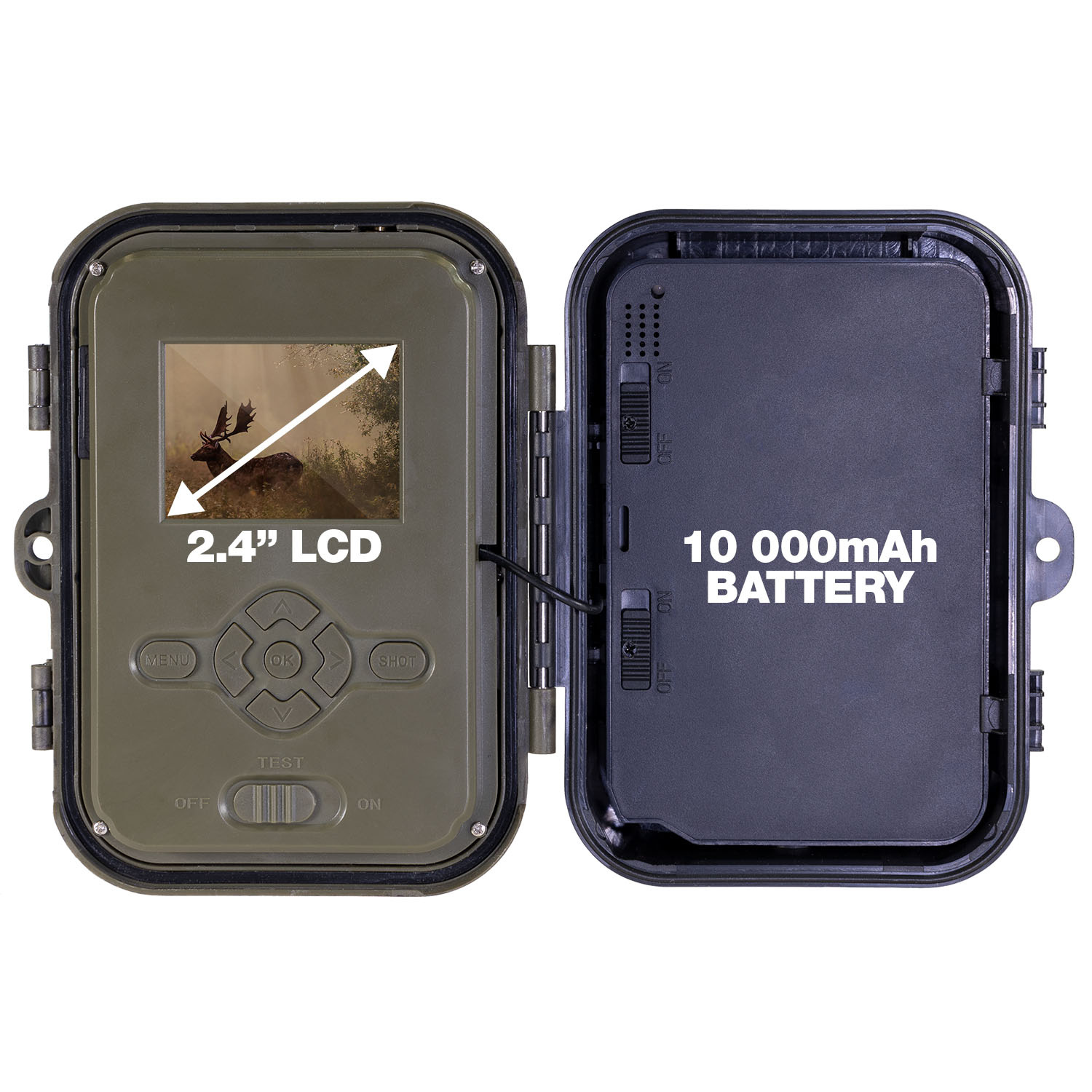 Jeden z důležitých parametrů každé fotopasti je její výdrž na baterii a zároveň i ekonomika provozu, díky nabíjecí 10 000 mAh baterii získáte zařízení s dlouhou výdrží na jedno nabití. Baterie je přímo vybavena nabíjecím konektorem a indikační LED diodou informující o stavu nabíjení.Akumulátor je dokoupitelný jako příslušenství, takže není problém používat dvě baterie, a jednou za několik měsíců jen vybitou baterii v kameře vyměnit za čerstvě nabitou. Samozřejmě že výdrž se může lišit při různých nastaveních (častý záznam videa) a také vlivem okolní teploty, kdy při teplotách bod bodem mrazu výdrž klesá.