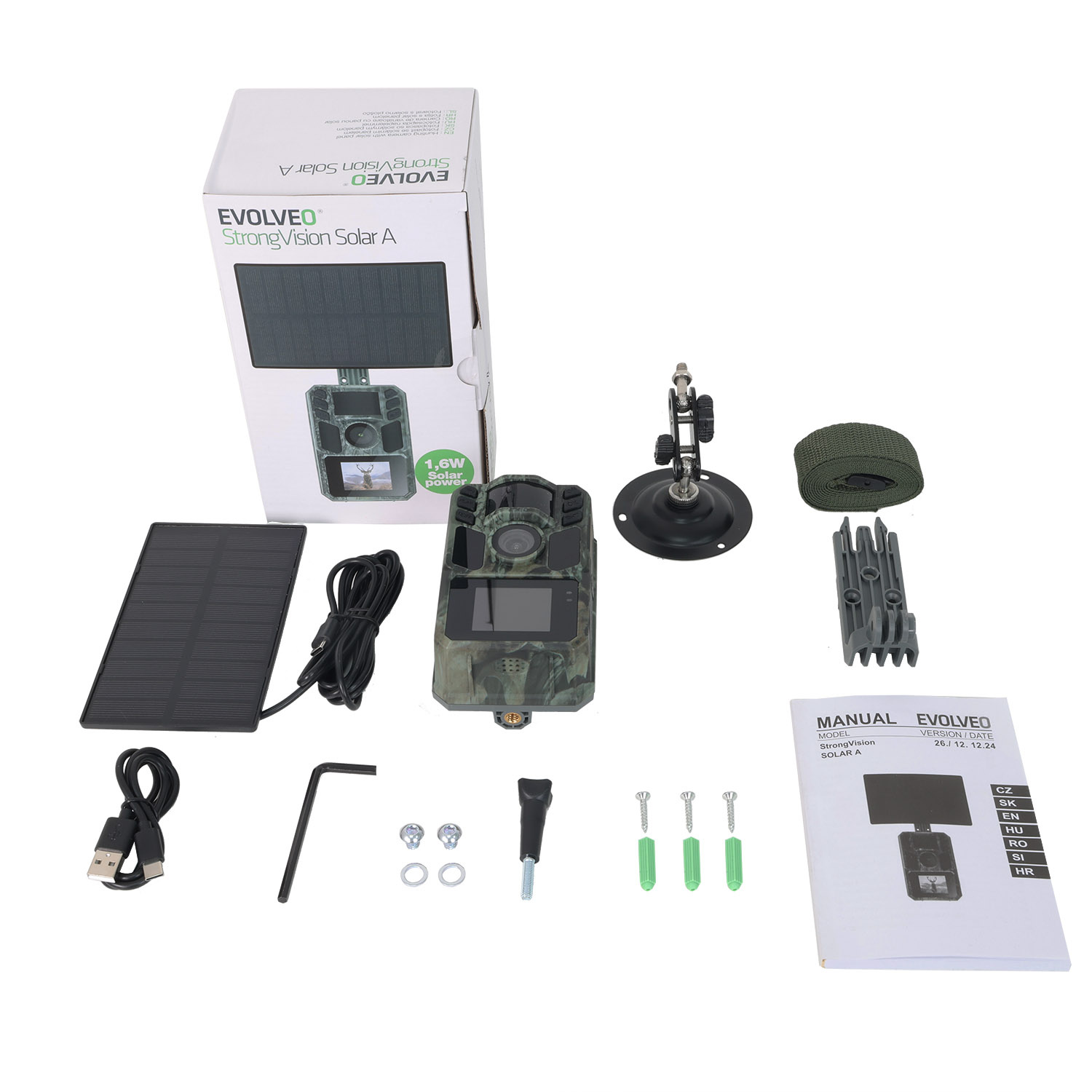 • Fotopast EVOLVEO StrongVision SOLAR A • Solární panel (1,6 W) • USB-C kabel (napájecí a datový) • Držák solárního panelu • Držák se závitem pro fotopast • Montážní šrouby • Upevňovací pásek • Uživatelský manuál (CZ,SK,EN,HU,RO,Si,HR) TECHNICKÁ PODPORA A SERVIS: podpora@evolveo.czDokumenty